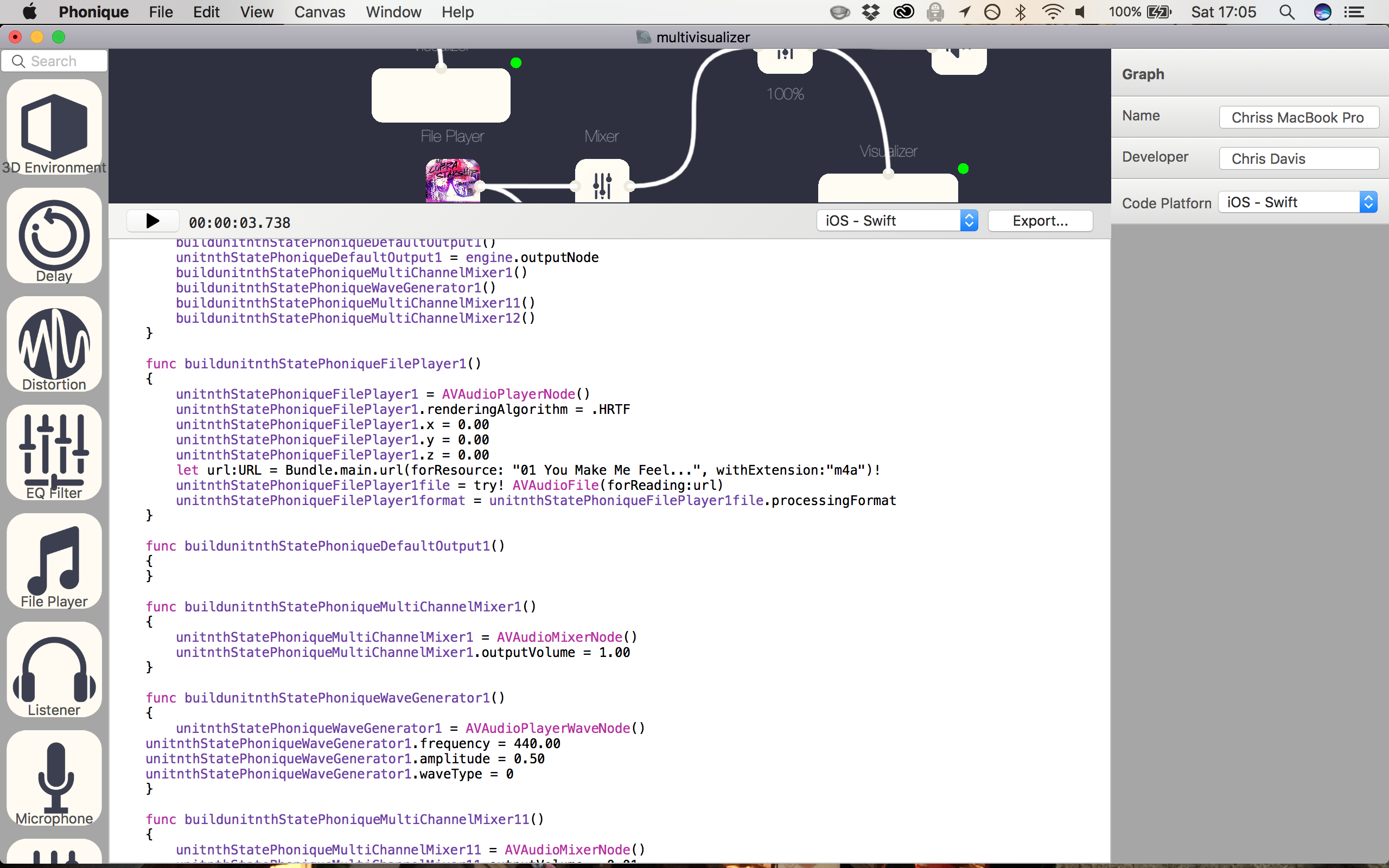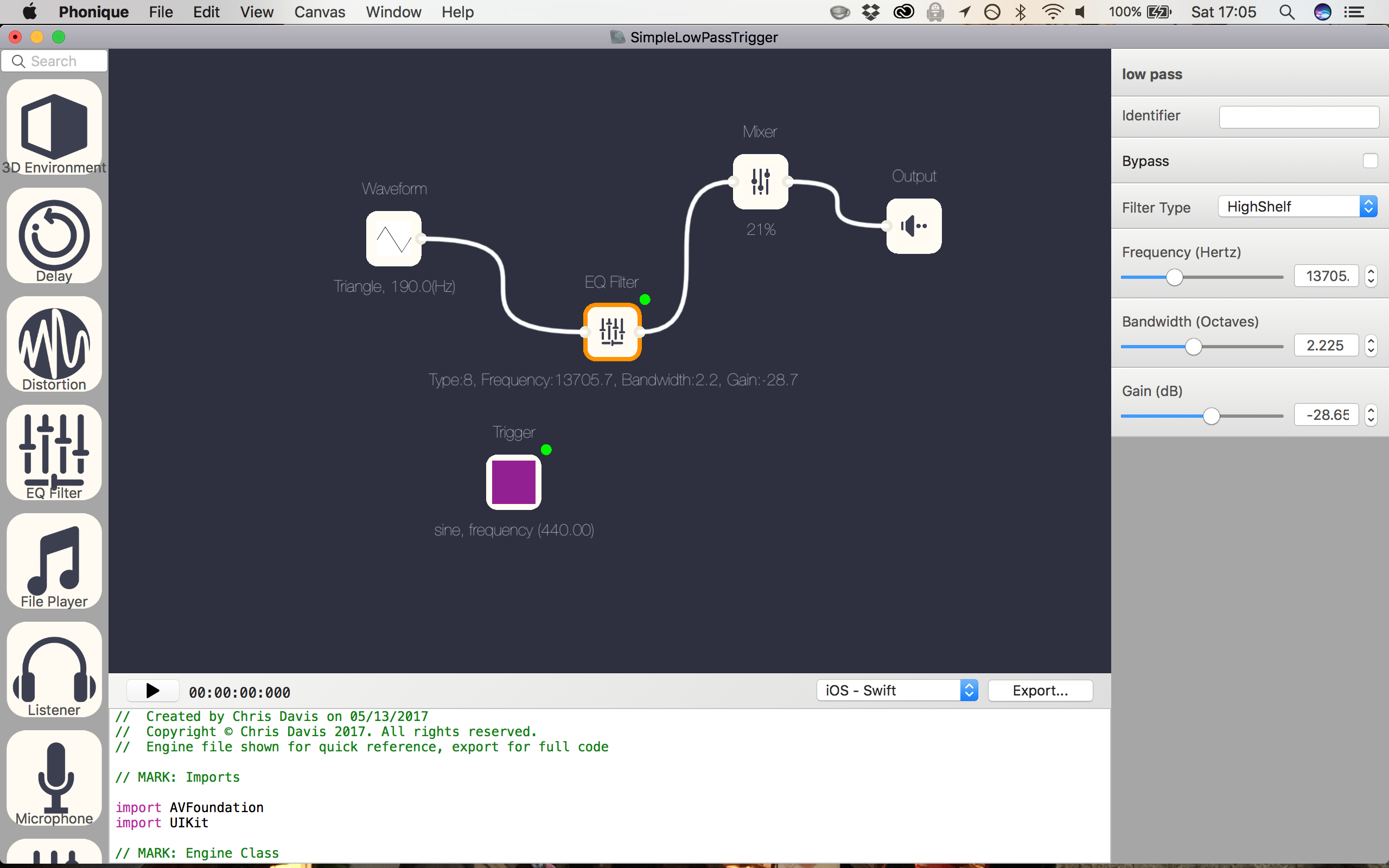 AVAudioEngine is one of these, connecting sound sources, to mixers, to effects to outputs in code worked, but it wasn't fun